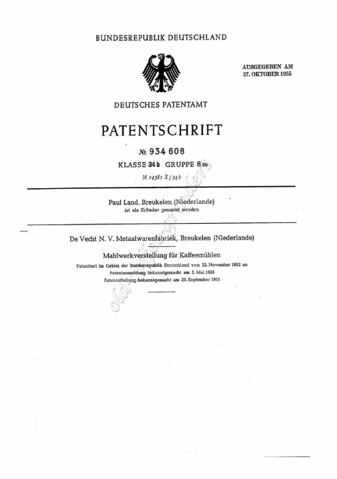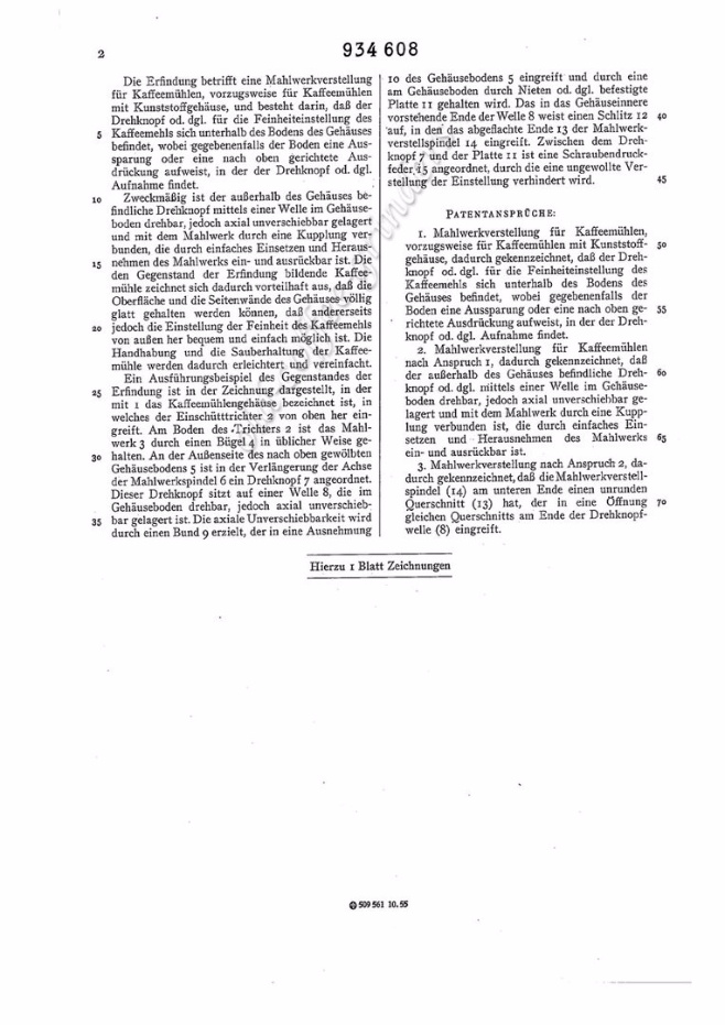 Patentschrift Nr. 934608 vom 27.10.1955 für die Mahlwerksverstellung der Kaffeemühle